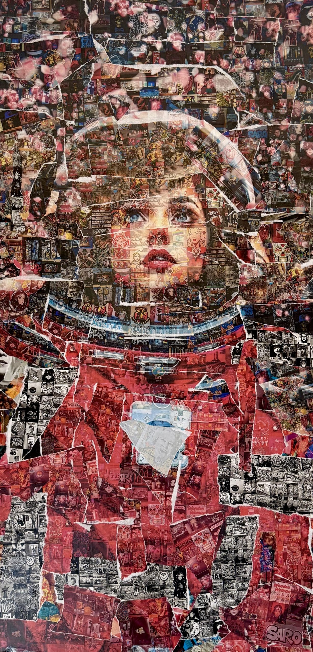 Accumulant une quantité phénoménale de clichés d’affiches, d’autocollants, de graffitis et de singularités trouvées dans les rues, SARO utilise ces éléments, collectés principalement dans des villes européennes et américaines, ainsi que dans les quartiers lausannois, pour créer des mosaïques représentant des femmes envoûtantes et portant un message bien précis.